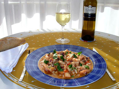 Feijoada de Chocos Por vezes apetece uma feijoada. Que não tem de ser de chouriços, mas de chocos. O prato é algarvio e de feitura simples, mas muito macio e saboroso. Use feijão de manteiga, demolhado de véspera, e coza-o em água temperada com sal, um fio de azeite e uma cebola Se não pensou de véspera, já se vende cozido em lata. Prefiro-o em frasco de vidro. Num tacho à parte, faça um refogado com azeite, cebola e tomate picados, este sem peles nem grainhas e com louro. Deixe alourar e junte os chocos, depois de limpos e cortados aos cubos, e ainda cenoura às rodelas. Junte um bocadinho da água de cozer o feijão e deixe cozer. Quando os chocos estiverem tenros, junte o feijão, mexa, corrija o sal e deixe apurar um pouco. Sirva polvilhando com salsa. Um excelente branco alentejano da Herdade Grande, honrou os chocos. Bom proveito. |